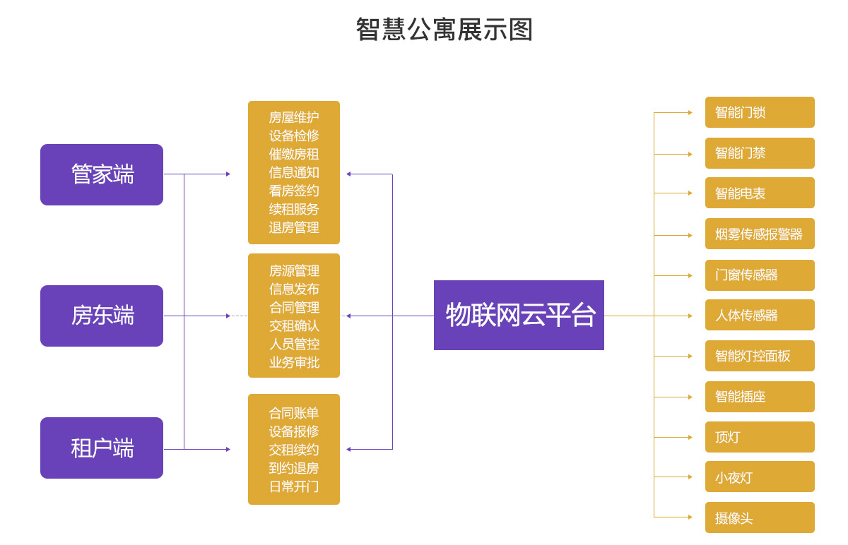 智慧公寓方案融合自動化控制系統、移動互聯網、物聯網和網絡通訊技術于一體,解決了傳統公寓存在的管理混亂、程序繁瑣、安全隱患等問題。包含用戶端、云平臺、智能終端三個層級。其中用戶端又分為管家端、租戶端、房東端,三方根據平臺分配的不同權限,運營統一后臺管理入口,集房源管理上線、營銷、租戶管理、費用收取、物業管理、客服管理等管理功能于一體,共同維護公寓的健康運營,實現公寓的智能化管理。