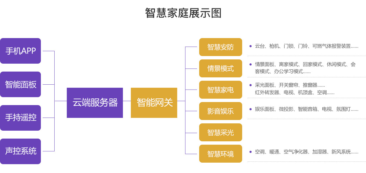 全屋智能家庭系統(tǒng),結(jié)合物聯(lián)網(wǎng)、云計算、移動互聯(lián)網(wǎng)和大數(shù)據(jù)等技術(shù),讓家庭智能產(chǎn)品與人實現(xiàn)互聯(lián)互動,打造出更宜人居、更節(jié)能環(huán)保的現(xiàn)代家庭生態(tài)系統(tǒng)。它主要包括家庭智慧安防、情景模式、智慧家電、影音娛樂、智慧采光、智慧環(huán)境等功能模塊。